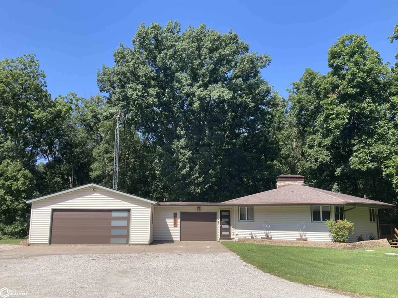 Imagine cozy evenings by the Anamosa Dolomite Limestone floor to ceiling gas fireplace centered in the expansive living room with vaulted ceilings and floor to ceiling windows. Interior of this midcentury contemporary ranch has been totally renovated on the main level and walkout finished basement. Approximately 1,869 finished square footage. Wooded setting of 4.77 acres more/or less with 2.76 acres in forest reserve. Newly constructed 40x50 foot workshop with concrete floor and 10 foot doors serviced by expansive gravel driveway. 3 car attached garage with 976 square feet, Very spacious walk in closets in both bedrooms and additional storage throughout. Additional 200+ square feet storage/utility room in basement. Entertain on the 614 square feet wooded wraparound deck located on the back of the home overlooking the wooded area. Home features 2 large bedrooms and 2 full baths with heated towel racks. Main level bathroom has surround bathtub/shower. Basement bathroom has surround shower. Main level laundry with cabinets and shelves for organization and storage. Walkout basement family room, both bathrooms and bedrooms have infrared heating panels in the ceiling for supplemental heating. Walkout basement has hanging wood swing bed over 243 square foot sealed concrete patio. There are metal panels under the wooded deck to shed water away from the concrete patio. Very unique property.
