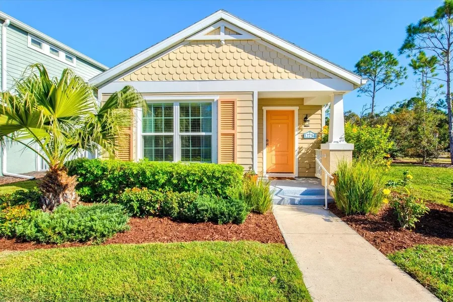 Enjoy peaceful pond views and glowing sunsets from the front porch of this picture-perfect cottage, ideally situated on a desirable corner lot within the gated, resort-style Grand Palm community. This impeccably maintained two-bedroom, two-bath home with an attached two-car garage is spotless, move-in ready, and filled with abundant natural light throughout.