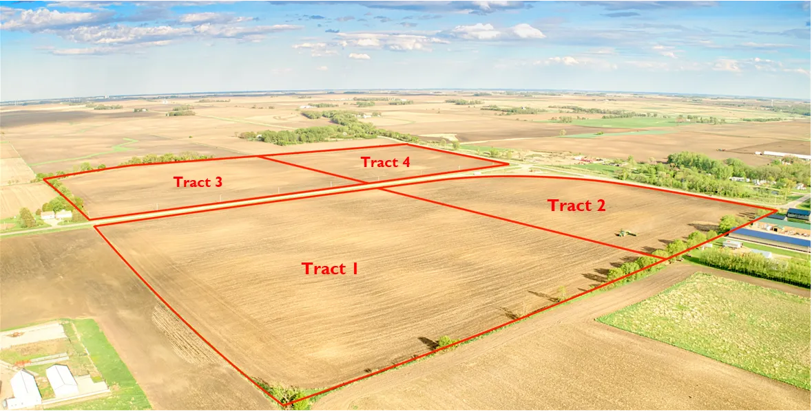 Tract 1 is 40 acres more or less and has an average CSR2 value of 84.2. Tract 2 is 20 acres more or less and has an average CSR2 value of 81.2. Tract 3 is 40 acres more or less and has an average CSR2 value of 78.7. Tract 4 is 28 acres more or less and has an average CSR2 value of 77.1.