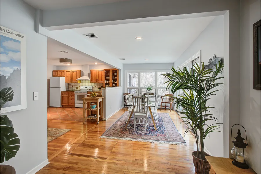 This one-of-a-kind updated cottage retreat offers the comforts of single-floor living and modern amenities amidst the beauty of a secluded sylvan setting along a babbling stream. Open and flowing entertaining spaces inside and out are united by plentiful, large, windows and sliding doors offering a year-round connection with the home's striking natural setting. The oversized living room features a wood-burning fireplace with striking rustic floor-to-ceiling stone surround as its focal point; this room could also be used as a living room/dining room or office. The primary bedroom features a large walk-in closet, a stunning renovated bathroom and laundry room, and water and mountain views through sliders leading to a patio area overlooking the stream. The home also features a large second bedroom, a renovated second full bathroom, mudroom with custom built-ins, hardwood oak floors, a first-level two-car garage with a heated office/workshop room, and a separate utility room. Upgraded mechanicals include a high-efficiency boiler and a stationary generator. Professional landscaping (hardscaping, accent lighting, and perennial flowering plants, shrubs, and trees) enhances the magical setting of this home throughout the year. This home is perfect for a buyer wanting to live in a move-in ready, hideaway home that makes every day feel like being on vacation. Convenient to shopping, commuting highways, recreation areas, and the historic village centers of Oldwick and Mountainville.