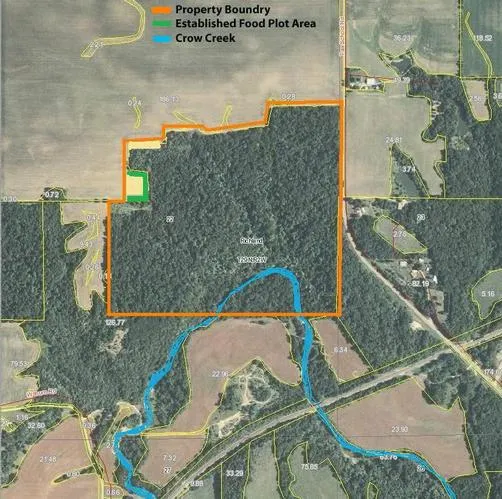 This farm is surrounded by big timber tracts and cropland fields, the area is well known for producing Big Bucks, and High Turkey density numbers. The property offers a variety of terrain changes from wooded flats and timber ridges to creek bottoms full of deer sign. The east side of the property has +/- ¼ of a mile of frontage on a hard road with multiple home sites. A building site has been cleared on the North east corner of the property and would make an excellent home or cabin construction site.
