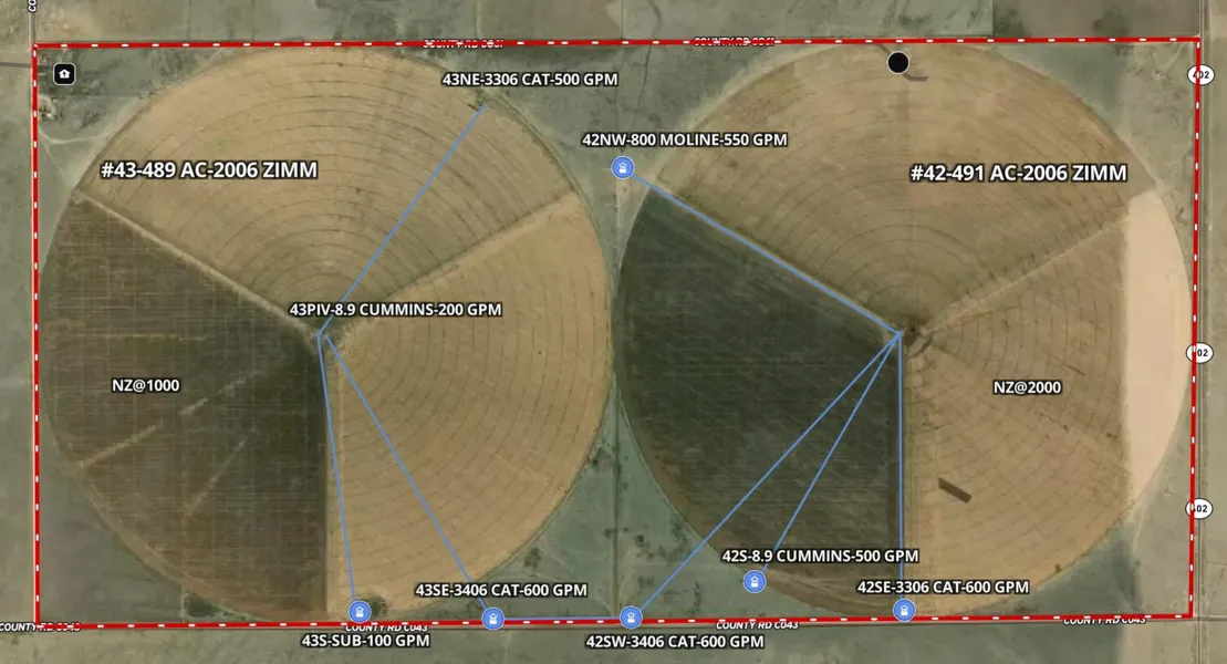 This property is offered in cooperation with Rowley Land Company in Clovis New Mexico. Located Northwest of Sedan, New Mexico on Highway 402, the Pearl farm offers a unique opportunity. This farm consists of approximately 1,280 gross acres with 980 irrigated acres. The two Zimmatic pivots have been in use on the property since 2009. Eight irrigation wells provide an estimated total output of 3,650 gallons per minute. The farm is also setup for winter cattle grazing with stock water available on each section. As you will see on the interactive map and supporting documents, all but one of the wells is powered by natural gas engines, but the farm is also equipped with electric infrastructure if there was ever a desire to change to electric powered motors. The house in the Northwest corner of the farm is currently occupied by a farm employee.