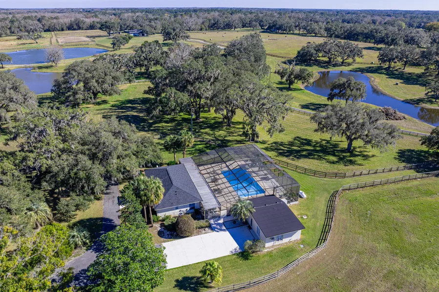 Welcome to a 125+/- acre breathtaking equestrian estate that captures tranquility, elegance, and privacy! This magnificent farm is truly a rare find nestled off the renowned 225A Golden Corridor and just 12 miles from the World Equestrian Center. Mature shade trees, lush green pastures, and gently rolling land, this property provides an idyllic setting for equestrian enthusiasts and those seeking a tranquil rural lifestyle. The extensive equestrian amenities include: Three Well-Appointed Barns: An impressive 18-stall show stable complete with two grooming stalls, an office, tack and feed rooms, a laundry room, an outdoor sitting area, and an upstairs 1-bedroom, 1-bath apartment. It is located adjacent to the grass jumping ring, the lit sand ring, the Eurosizer, round pens, and the turnout paddocks. A second barn featuring 23 stalls, a grooming stall, wash stalls, and a comfortable 3-bedroom apartment. A third barn features 6 stalls, an outdoor wash stall, and an efficiency apartment to accommodate your horses perfectly. You'll also enjoy a spacious main residence that boasts 3 bedrooms and 2 baths, designed with a screen-enclosed pool, plus a separate 1-bedroom, 1-bathroom guest apartment, making it ideal for family or visitors. As an added bonus, this property includes a generous 4-bedroom, 2-bath staff house, and 2 RV Hook-ups, ensuring you have everything needed for a seamless operation. Experience the serenity of nature with three picturesque lakes that enhance the charm of this exceptional property. This turnkey equestrian estate is a dream come true for horse lovers and those seeking a private sanctuary with top-tier amenities. Don't miss this unique opportunity to own a piece of paradise! Schedule your tour today and step into a life of luxury and tranquility!