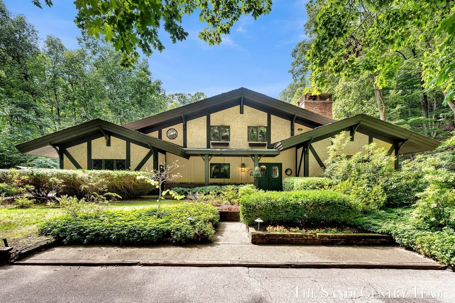 Rarely does an opportunity like this become available. Priced below market value, this distinctive Tudor-style home offers more than 4,100 sq ft of finished living space and is nestled on just over six acres of serene, wooded privacy. Rich in timeless architecture and character, the home provides an excellent canvas to make it your own. Step inside the impressive foyer featuring slate flooring and a sweeping curved staircase that immediately highlights the craftsmanship found throughout the home. The dramatic great room showcases vaulted wood-beamed ceilings, expansive windows that fill the space with natural light, and a striking double sided stone fireplace shared with the adjacent family room and kitchen, creating a warm and inviting flow throughout the main living areas. A formal dining room, spacious kitchen with custom cabinetry, and multiple gathering spaces make the main floor ideal for entertaining and everyday living. Upstairs, you will find 3 comfortable bedrooms, including a generous primary suite with sliding doors that open to a private balcony, perfect for morning coffee or relaxing while enjoying peaceful wooded views. The finished lower level provides additional versatile living space, well suited for a recreation room, home gym, or media area. Outdoors, enjoy a private retreat complete with a wraparound deck, hot tub, firepit, and multiple seating areas surrounded by mature trees and lush landscaping. An attached 2-stall garage is complemented by a detached garage that includes an office, a 220 outlet, and its own independent furnace, offering exceptional flexibility for vehicles, storage, hobbies, or a private workspace. Conveniently located just minutes from Lake Michigan beaches, Rosy Mound County Park, downtown Grand Haven, biking trails, and Grand Haven High School, this home combines privacy and charm while remaining so close to everything, yet nestled in a peaceful, wooded setting.