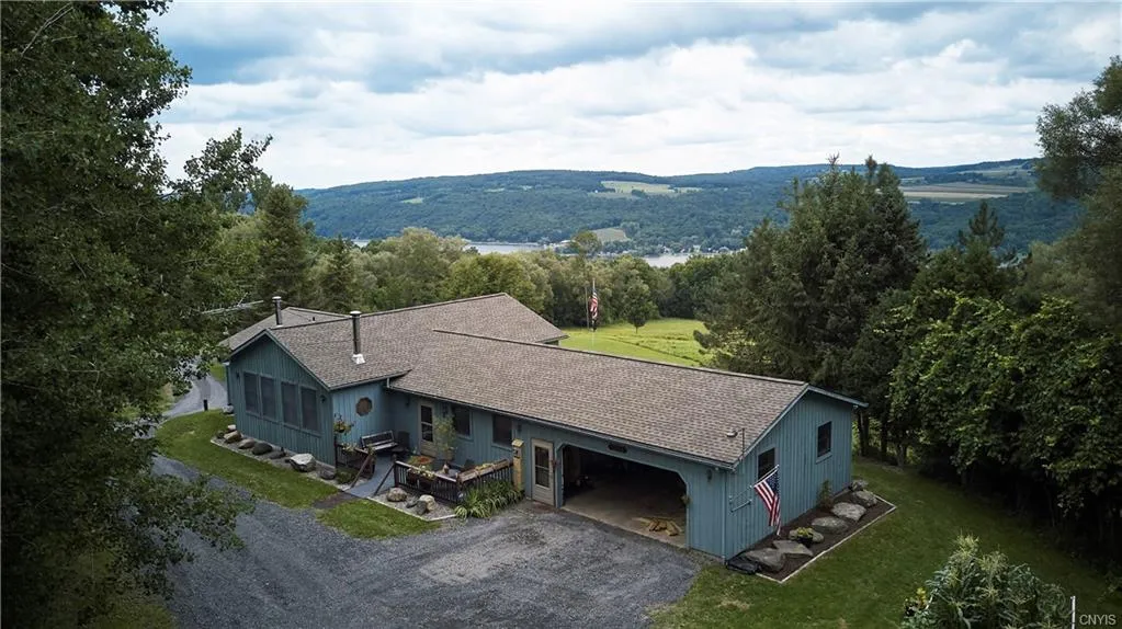 This home is a stunner! So much space and gorgeous views. A grand 3,408 square foot home with amazing views of Otisco Lake and the hills beyond. It's a 2-story into a hill but looks like a ranch from the front. The kitchen, enormous great room (24x38 ft) - a combined dining room and living room, laundry room off kitchen, a half bath, and master suite with full bath are on street level. Three additional bedrooms and another full bath, along with a full bar set up for entertaining are on the lower level. There's also tons of storage off the main living area on the lower level. There is a separate workshop at the bottom of the driveway with power, heat, water, and an air compressor that comes with it. There is a two-car attached garage then also a 1-car garage under the house - great for storing a small snow plow. Tons of land for hunting, four wheeling, hiking - so many options! This is two parcels combined for sale: Tax Map #315200-022-000-0001-043-001-0000 is the 58.45 acre parcel and Tax Map #315200-022-000-0001-042-002-0000 is the 3.12 acres where the home is situated. The wine cooler in the kitchen does convey.