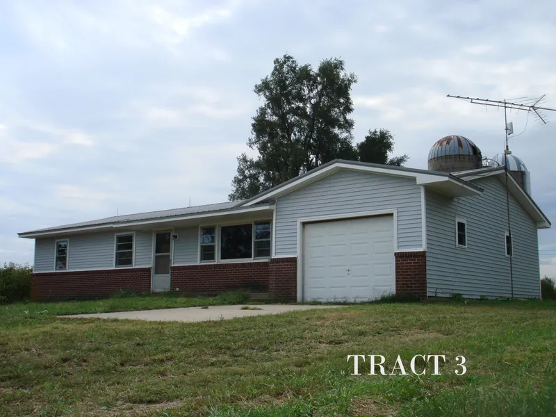 Tract 3 is a peaceful country home with a beautiful pond view only 2 miles from Highway 73. With 13 acres and a 50x 80 shed this property would welcome outdoor pets and livestock. The 3 bedroom home features an attached garage and full basement.