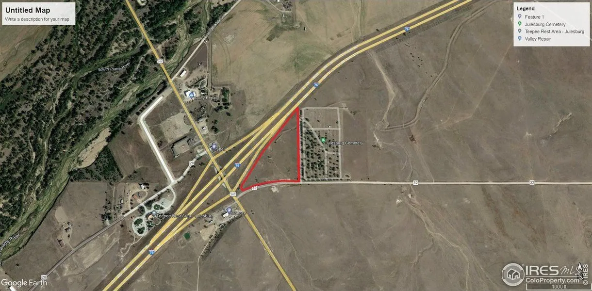A 13.19 acre parcel of land on the southeast corner of the Interstate 76-US Highway 385 intersection south of Julesburg CO. Land for development with a private well and county road frontage.