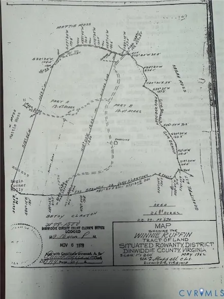 13.4 Acres in Dinwiddie County! Come take a look at this property! Private setting with pond views! No known ownership of pond. Access is a down private drive named Whitmore Moss Dr. off of Fox Branch Rd. Please see supplements for Plat.