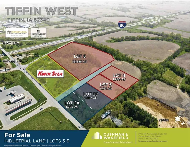 Industrial land for sale and/or build-suit-available in the Tiffin West Development off of the I-80 & I-380 interchange. Ownership includes a licensed real estate agent in the State of Iowa. Lot 5 - 13.688 AC DO NOT USE SHOWINGTIME. Contact Listing agent for property viewing and additional information.