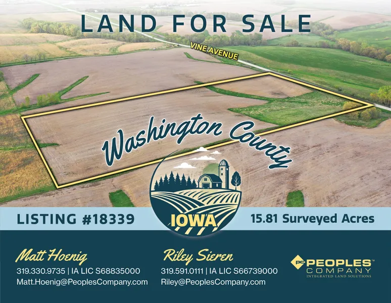 Prime 15.81- Surveyed Acre Hobby Farm / Building Opportunity in Washington County, IA - Peoples Company is proud to present a rare opportunity to own and invest in your dreams with 15.81 acres m/l of highly productive farmland nestled in the heart of Washington County, Iowa. Situated just 6.5 miles south of Riverside and a short 20-minute drive to downtown Iowa City, this property offers both the tranquility of the countryside and convenient access to Interstate 218 and urban amenities.