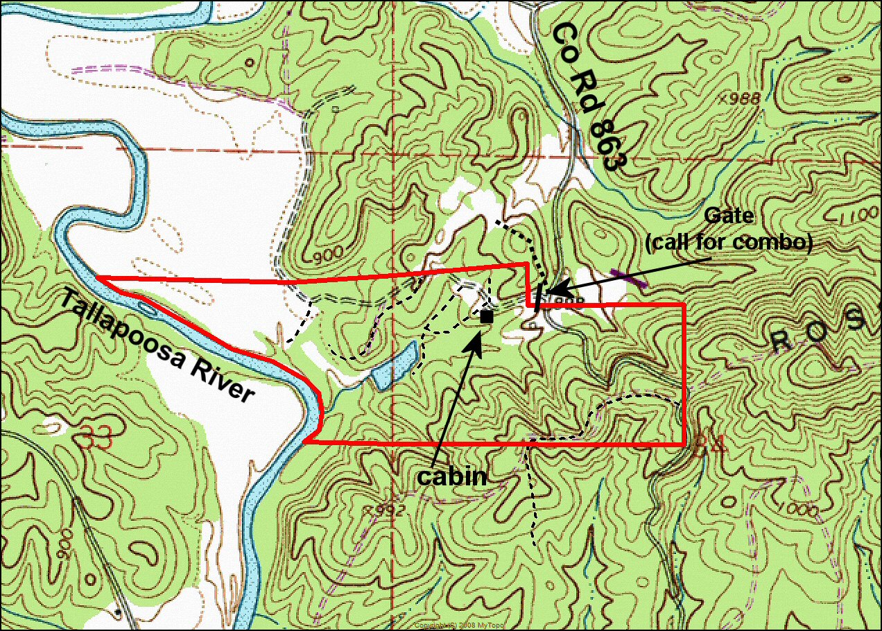From I-20 Exit 199, go south on Hwy 9 for 1.9 miles. Take a left on County Road 19 and go 2.2 miles. Take a left on County Road 36 and go 0.5 miles. Take a left on County Road 863 and go 0.9 miles to the property entrance and gate on the left. Look for the Cyprus Partners sign. The gate is locked so call the agent for a gate combo. You are welcome to look on your own or you can set up an appointment. A pickup truck will be needed from this point on. Use the aerial photo as a guide. The entrance gate is located at Lat: 33 35 36.33 N. Lon: 85 34 53.51 W.
