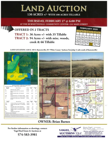 130 ACRES OF GROUND FOR AUCTION WITH APPROX. 100 ACRES TILLABLE. OFFERED IN 2 TRACTS. TRACT #1 HAS 36 ACRES WITH APPROX. 35 ACRES TILLABLE. TRACT 2 HAS 94 ACRES WITH APPROX. 66 ACRES TILLABLE, REMAINING BEING WOODS/CREEK. AUCTION LOCATED AT BURNETTSVILLE COMMUNITY CENTER 311 MAIN STREET BURNETTSVILLE, INDIANA THURSDAY FEBRUARY 27, 2020 6:00 PM EASTERN STANDARD TIME.