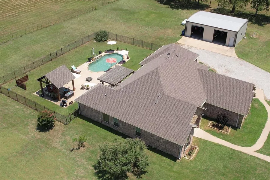 Prime location minutes from Texas Instruments and Global Tech headquarters, located between Preston Rd and 75 with built in pool and big Texas sky to take in sunrise and sunsets. Custom built one story featuring concrete flooring, open floor plan, custom columns, stone fireplace and plantation shutters. Incredible kitchen, custom cabinetry, kitchen aide appliances including commercial grade gas stove top. Bedrooms are large with a split floor plan offering a mother in law accessible entrance and floor plan. Breath taking views overlooking built in pool with covered cabana and pergola are priceless. Home is energy efficient featuring sprayed in foam insulation, 500 gallon propane take, tankless water heaters, and more. 40x30 shop with electricity, bathroom, washer and dryer hookup, extra parking, welding outlets and more. ADDITIONAL ACREAGE AVAILABLE UPON REQUEST