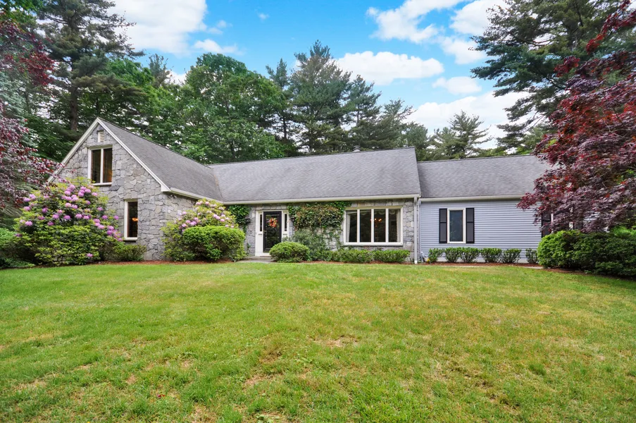 Perched on a knoll and surrounded by lush, mature plantings, this unique expansive Cape offers old-world charm in a sought-after Acton Center location. Stroll up the front garden path and enter the gracious foyer that opens to a dramatic vaulted-ceiling great room with a beautiful stone fireplace. Entertaining? Enjoy the easy flow from the kitchen to the lovely, light-filled dining room featuring a wall of windows overlooking the front yard. Spend afternoons outside on the patio, in the cozy family room w/gas fire place, or in the charming sunroom that doubles as another living or dining room. The convenient first-floor main bedroom and bath allow for flexibility. Two bedrooms with hardwood floors and a full bath round out the second floor. The huge unfinished basement offers endless possibilities. A 2-car garage, hardwood floors, central A/C, lots of storage, and more. This well-kept, cherished home offers privacy and convenience. A special property.