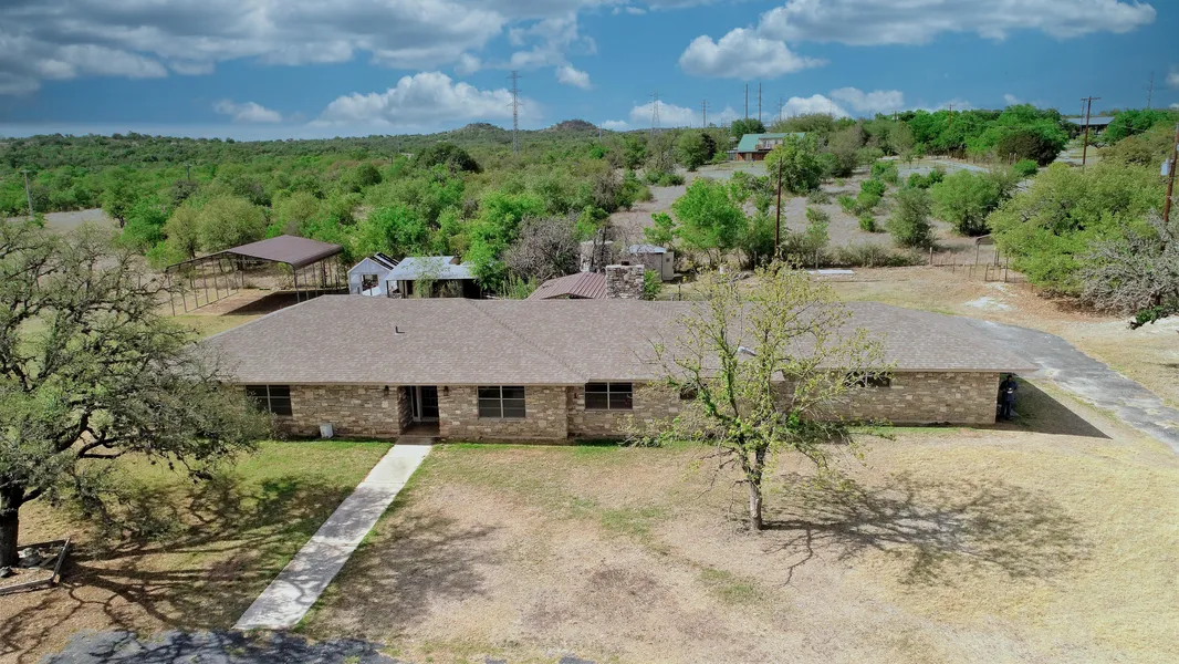 Live and Have Your Business Too! All on 3.96 ACRES! Three Bedrooms, Four full Baths, Office, Living Room with Fireplace/wet bar/built-in bookcases, and a Dining Room. PLUS this over 2500 sq. ft. house has a large airy kitchen with breakfast area. Attached oversize 2 car garage! The flooring in this home is slabs of Terrazzo purportedly from a 1950's era Austin Bank. This stone veneer home is located on a small hilltop overlooking the Guadalupe Valley and has excellent access to Hwy. 27 in Center Point. Only 9 miles to downtown Kerrville and 45 minutes from The Rim in San Antonio. THE BACKYARD could be an outdoor entertainment mecca since it already has a covered pavilion with wood deck and bar area. There's room to store your RV's or large vehicles in the RV Port. This property also has barns and sheds for your animals and 4-H projects. PLUS there is a chicken coup area, and conditioned storage building. NO RESTRICTIONS - COMMERCIAL USE PERMITTED. This property has everything the country living buyer wants!
