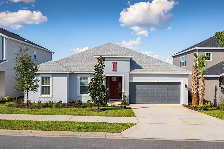 Craftsman-style new build. Gated community with pool. The Amelia model is a gorgeous split floor plan, open concept home with lots of natural lighting and upgrades, including 8-foot doors, neutral wide-wood plank floors throughout main living areas, three-car garage, tray ceilings, high-end kitchen cabinets, granite countertops and marble backsplash. Kitchen has tasteful, light and bright finishings with a walk-in pantry. The large kitchen island has a view of the spacious gathering room and dining area. The large kitchen window paired with pocket sliding doors to the lanai allows lots of natural light to pour into the open room. Huge master includes an equally large bath with double sinks, a large, spa-like shower, soaking tub and private toilet room. Bedrooms 2-3 both have walk-in closets and their own baths. Bedroom four can be used as an office or additional room for guests, in-laws or teenagers. Tandem three-car garage. Great floor plan. Don't miss out on this beautiful home.