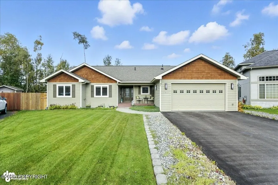 Stunning ranch-style home nestled on a peaceful cul-de-sac, offering a serene environment with an excellent commute to both the base and Anchorage. Inside and out, this home has been meticulously upgraded, featuring elegant quartz countertops, top-of-the-line cabinetry, and high-end hardwood flooring. The exterior is equally impressive with 50-year shingles and a fully covered deck,