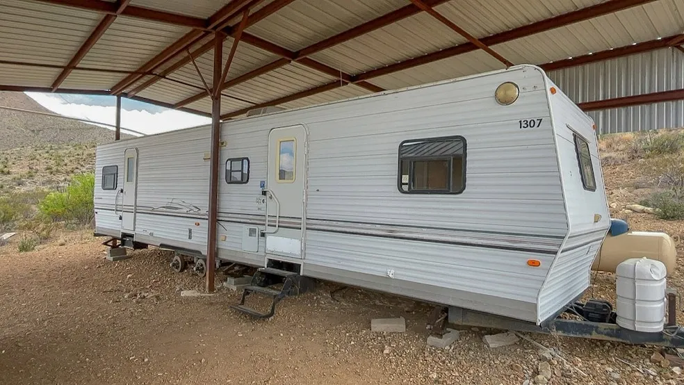 Welcome to tranquility embodied in the heart of Terlingua Ranch! Nestled within the captivating landscapes of West Texas, this property boasts breathtaking views of the Corazon Peaks and surrounding Christmas Mountains. A 30'x40' metal shade structure provides protection from the elements. Camper had been removed. Dersken building. Electricity meter provides power to Dersken building and camper hookup. 2500 gal water storage tank and 120 gal propane tank included!