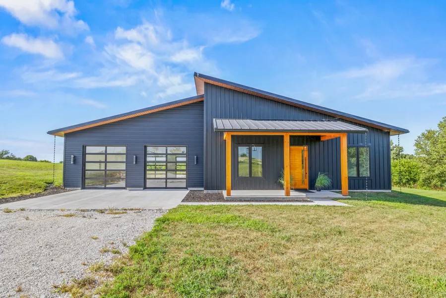 Set on 12.5 +/- gently rolling acres in the heart of the Ozarks, this custom-built modern home offers unmatched craftsmanship, privacy, and panoramic views in every direction. A long gravel drive leads to a one-of-a-kind four-car pull-through garage and a sleek, maintenance-free exterior wrapped in seamless board and batten metal siding, black Anderson casement windows, and a standing seam metal roof. Designed with durability and efficiency in mind, the home features 2'x6' exterior walls for enhanced insulation, roof trusses for structural longevity, spray foam insulation, and Cat6 wiring throughout.