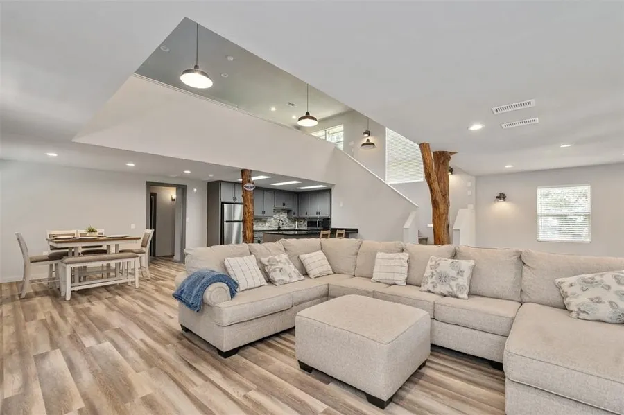 Welcome to your own lakeside retreat that offers breathtaking views of the lake! Beautifully renovated throughout on 2 lots with community boat launch. Home features a huge open floorplan with room for two Living areas and a Formal Dining. Kitchen has granite counters, beautiful brick wall and backsplash, breakfast bar, farm sink. Decorative lighting, luxury vinyl flooring and 2 inch blinds throughout. Accent woodwork for columns. Living and Formal Dining lead to a balcony. Downstairs has two additional bedroom and bath with a pedastal sink and walk in closets. Spacious laundry room has room for freezer or additional refrigerator. Upstairs has a gameroom area, and huge master ensuite with a private bath and granite vanity. Additional bedroom upstairs has walk in closet and open concept with room for multiple beds or a bunkhouse theme. The is also an upstairs balcony. This is a great house for entertaining large families and friends. The exterior is easy maintenance vinyl siding. Additional parking for boat and guests. Positioned across the street from the lake, fabulous trees and access to a community pier and boat launch. Outdoors has a charming fire pit area, complete with chairs for your relaxing lakeside living.