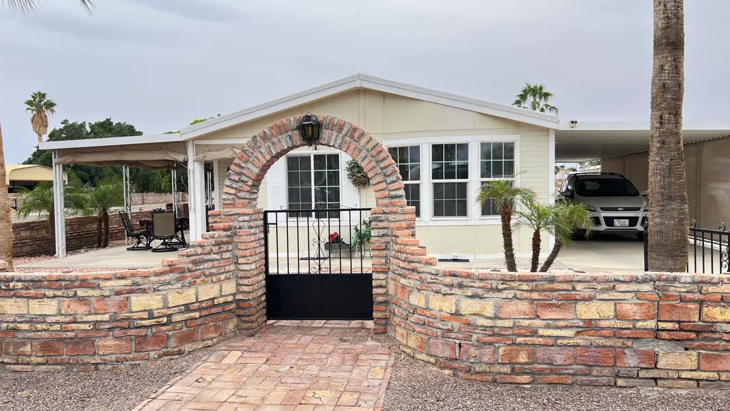 Completely Furnished Double Wide Mobile Home. Corner view lot with two entrances. New updated include wood flooring, insulated thermopile windows, solar screens, new insulated thermopile windows, solar screens, new insulated roof with 4 inch of insulation, heat pump/ AC, electric appliances, stainless-steel, water heater, reverse osmosis, water softener, toilets, bathroom sinks, counter tops and extra parking concrete pad. Shed with 3/4 bathroom. Two 30 & one 50-amp RV Hook-ups.