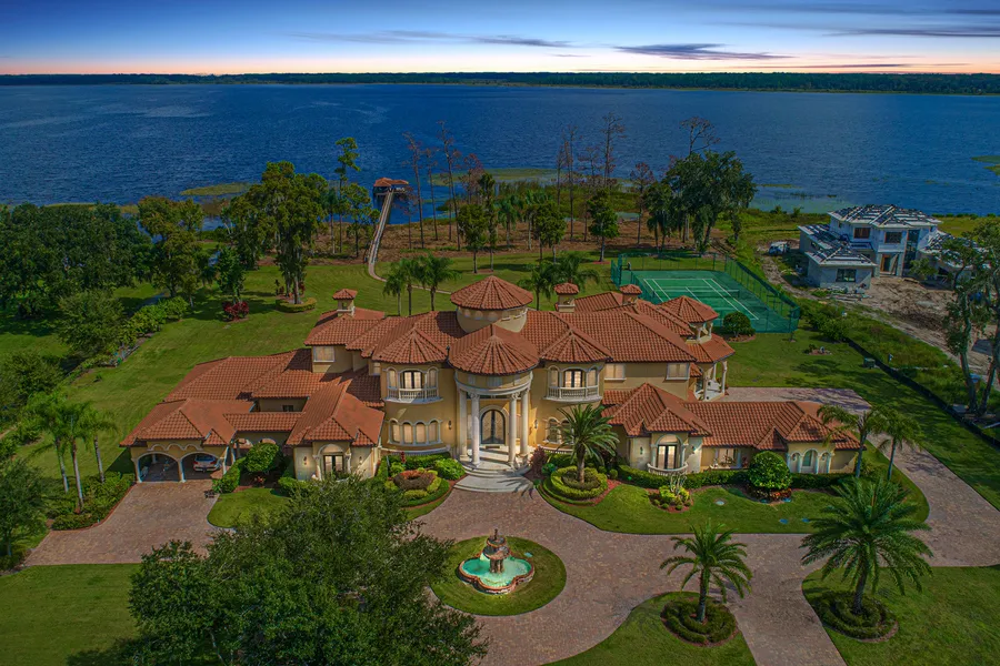 One or more photo(s) has been virtually staged. Live the dream on Lake Hart. Minutes to the Lake Nona Medical City, OIA, golf courses, great schools and much more. This private, one-of-a-kind estate has 300 feet of waterfront on 4.22 pristine acres and feels like you are living in a five-star resort. Designed to maximize views from every room, this home will exceed all of your expectations. Offering 9,609 interior square feet and 15,573 total square feet with outdoor living the home boasts 5 bedrooms, 7 and 1 half baths with custom finishes handpicked from all over the world. Features include two full bars, coffered and tray ceilings, elevator, crystal and 22-carat gold plated chandeliers, four fireplaces and a wine cellar just to name a few. Enter into the grand foyer with glowing marble floors and columns, walls of windows that showcase the pool and lake views. The Elan smart home system can control almost all of the lighting, TVs and speakers with a push of a button. An elaborate split winding staircase has soaring ceilings that take your breath away and connects you to the formal dining and living rooms. Head to the west wing where you find the master suite that is fit for a king. Relax and unwind in this spacious retreat with stunning wood floors, tray ceiling, sitting area, crafted wall molding and direct access to the spacious pool and lanai. The spa-like master bath amazes with dual powder rooms, a luxurious shower with multiple shower heads, jetted tub, dual custom walk-in closets with islands and dressing room, and more storage than you could ever need. Just off the bedroom is a stunning mahogany executive office with built-ins and custom finishes, a powder bath, and a bonus room. Head over to the east wing where you find the Parade of Homes Grand Prize Winner Kitchen. This luxury kitchen is designed with great attention to detail and an array of updated and amazing materials and finishes that include Wolf stainless steel appliances, gas stove with griddle and pot filler, super island, double sinks, coffee station, and hidden walk-in pantry. The breakfast room leads to an expansive family room with a marble fireplace. Walls of sliding doors bring the outside in and access the pool and lanai. This is the perfect entertaining space to enjoy cool evenings and watch the sun set over the lake. Completing the first level is a full laundry with pet washing station, en-suite guest bedroom and powder bath. A separate world beckons family and guests on the second level with three complete suites, all with an outdoor deck. Entertain and play in the recreation room that features a full bar, TVs and room for a billiards table. If you want to watch the latest movie, grab your popcorn and head to your private home theatre and enjoy. Store water toys, boats or cars in any of the two garages with five bays or the carport. The beautiful backyard sanctuary will knock your socks off with its jaw-dropping pool with sun shelf, spa, and a vanishing infinity edge giving plenty of relaxation options to lounge and take in the Florida sunshine. There is also a tennis court and basketball court and enough lawn space for all kinds of fun - bounce houses, badminton and soccer games. Head down the dock to the large boat dock that holds up to a 28' boat with 300 feet of pure lakefront. The layout facilitates all kinds of get-togethers with amazing views that make this property irreplaceable. Truly a once in a lifetime opportunity to own in Orlando and no HOA. A must-see, make your appointment today.