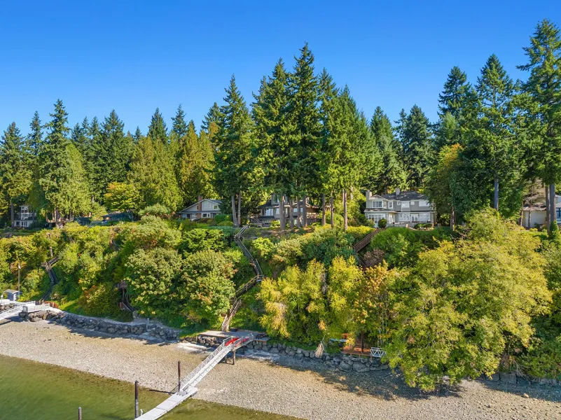 Nestled in Manzanita—one of Bainbridge Island’s most prized west-facing waterfront neighborhoods—this stately traditional estate captures sweeping views of Puget Sound, the Olympic Mountains, and sunsets that paint the sky in brilliant color. Perfectly sited on 2.37 level acres with 79 feet of mid-bank waterfront, the home itself spans nearly 5,800 square feet, including a 909-square-foot one-bedroom guest suite above the garage. A picturesque tree-lined drive introduces the residence and opens to an expansive front yard that sets a truly grand stage. Custom-designed and built by Smallwood Construction, the home reflects timeless East Coast–inspired architecture seamlessly blended with its stunning Northwest setting. Inside, sunlit interiors balance refined detailing with a relaxed coastal sensibility, creating spaces that are both elegant and welcoming. On the water side, a second lawn flows to the bluff’s edge, where stairs descend to a private walkable beach and permitted mooring buoy. Whether entertaining on the terrace, wandering the grounds, or savoring sunsets over the Olympics, this is waterfront living at its most captivating - an extraordinary combination of privacy, scale, and lifestyle.