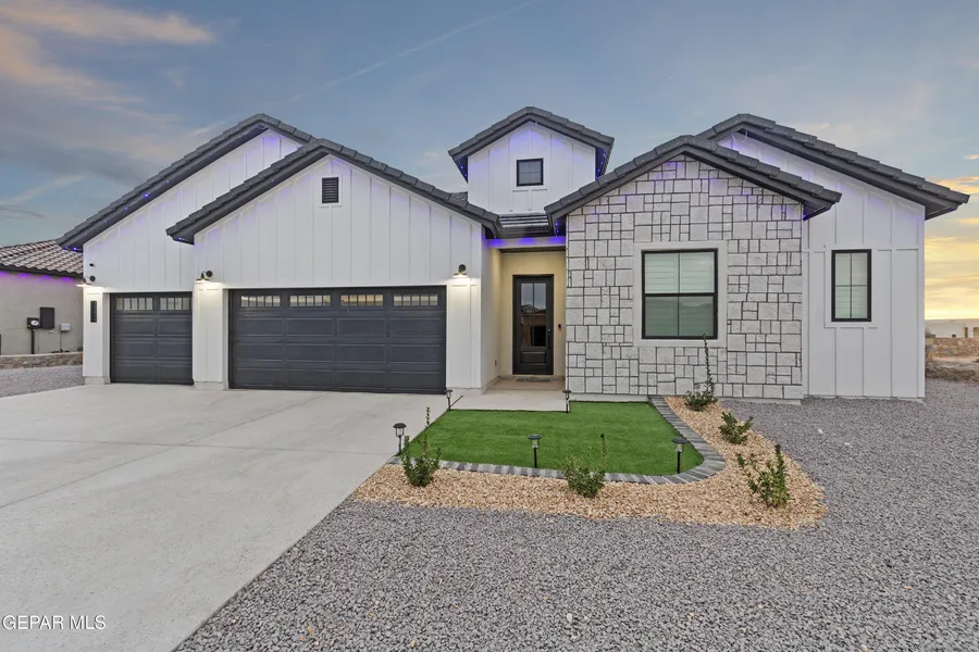 A like-new LEH Farmhouse on a spacious lot in Horizon City, this 4BR/4BA home blends modern luxury with timeless style. Less than a year old, it features 12-ft ceilings, a bright open floor plan, and premium upgrades including a fully landscaped front and backyard and water softener system. The gourmet kitchen shines with a farmhouse sink, sleek cabinetry, large island, and designer finishes. A 4-panel sliding glass door floods the living area with natural light and opens to the extended patio, perfect for entertaining. North-facing for ideal daylight balance, this move-in-ready home offers upscale finishes, elegant architecture, and a true luxury lifestyle from day one. Move-in ready and priced to move-this is a home you don't want to miss.