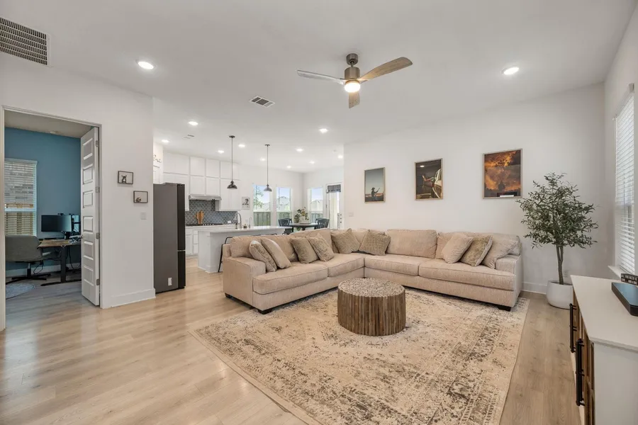 Spacious and Modern Living in Parmer Ranch! This 4-bedroom, 2.5-bath home with a downstairs flex space or 4th bedroom offers nearly 2,500 sq ft of well-designed comfort. Bright white cabinetry, luxury vinyl plank flooring, and full-height finishes create a clean, cohesive look throughout. The main-level primary suite features a dual vanity, walk-in shower, and soaking tub for added convenience. Upstairs, you’ll find spacious secondary bedrooms, a versatile loft, and ample storage. Additional highlights include a water softener, reverse osmosis system, irrigation, smart lighting, hardwired Ring cameras, and gem lights. The private backyard with a covered patio is ideal for outdoor gatherings, and residents enjoy access to community amenities, including a clubhouse, pool, fitness center, parks, playgrounds, sports courts, and trails. If buyer uses the seller’s preferred lender, the lender will pay for the cost of a 1/0 temporary rate buy-down, meaning the buyer’s first 12 monthly payments of the loan will be calculated at a 1 percent lower rate. Seller will offer professional cleaning prior to closing and will provide a complimentary one year home warranty.