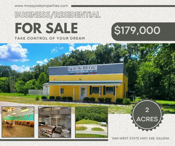 Close to the river and up on a hill sits so much opportunity... with so many possibilities. This commercial building is set up for a restaurant currently, but you can literally turn it into anything you choose...follow your dreams! It comes with an outdoor freezer, storage unit, large vent-a-hood, tables, chairs, and booths inside for restaurant operation or maybe lease it out. You could also clear it all out and start something entirely different. There's a pad for a mobile home or camper to live on-site with city sewer and water. Conveniently located near downtown Galena. Don't miss your chance to own this great business opportunity!