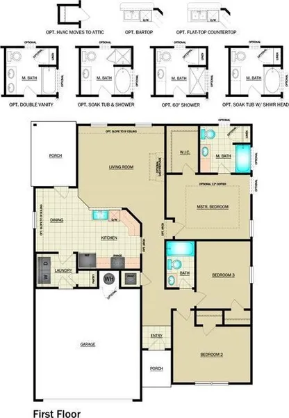 The FOSTER floor plan is a single-story home that blends style with functionality. Two secondary bedrooms share a bathroom in the hall at the front of the home, while the owner's suite is tucked into the back corner with a private bathroom. Down the hall is the free-flowing main living area, which includes a kitchen with a center island, a welcoming family room and a dining room with a covered rear patio. A convenient two-car garage completes the home. Prices, dimensions and features may vary and are subject to change. Photos are for illustrative purposes only. Home is currently under construction with anticipated completion in February.
