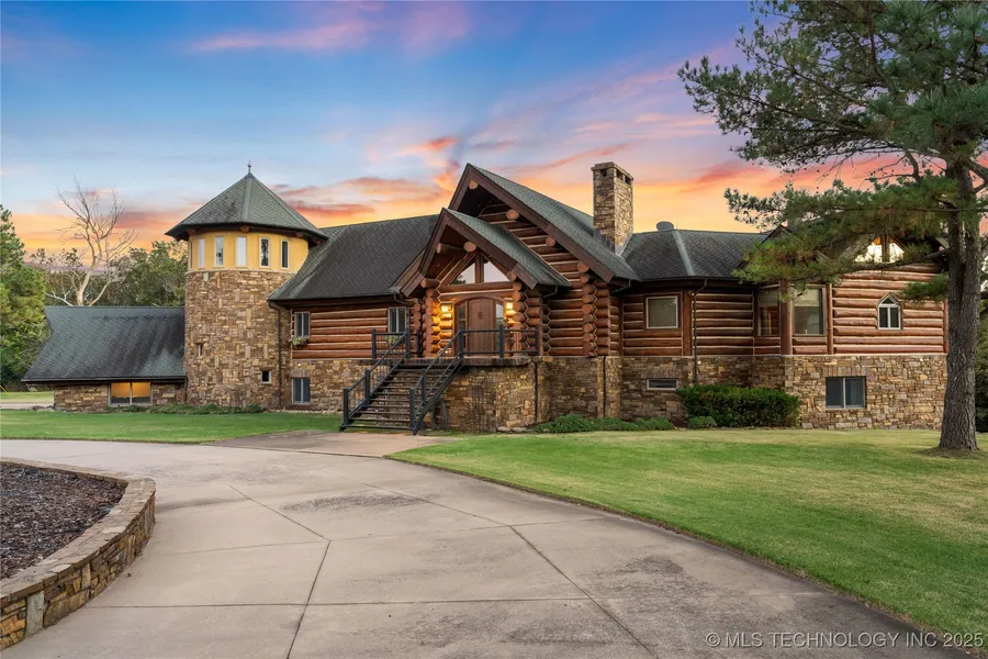 Experience riverfront living at its finest on this private 74± acre estate along the Illinois River. This custom 6,737± sq ft luxury log lodge features 5 bedrooms, 4 full baths, 2 half baths, and exceptional craftsmanship throughout. The great room showcases soaring timber ceilings, a dramatic stone and plaster fireplace, and floor-to-ceiling windows framing wooded and river views.