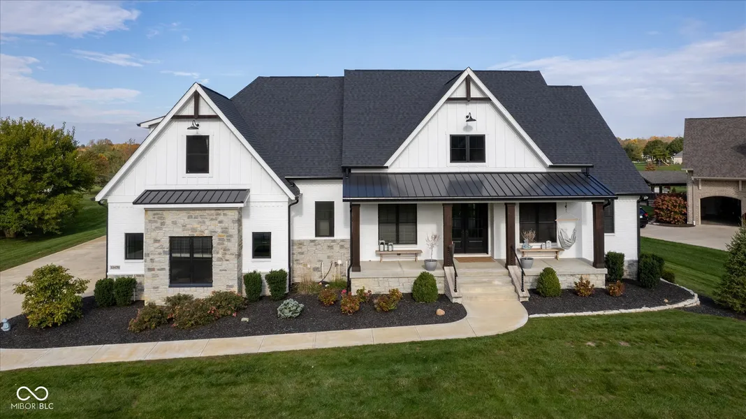 Stunning Custom Modern Farmhouse built by Carrington Homes in HSE schools 6 bed 4 full bath 2 half bath in gated Barrington Estates offers over 5000 sq ft of luxurious space on serene 1.27 acres of prime waterfront property including deck firepit and mature trees. As you enter the beautiful glass double doors into tastefully put together entryway you are greeting with a contemporary yet rustic living space with open flowing floorplan. The gourmet kitchen is a chef's dream with large island, top of the line ss appliances, walk in pantry and separate butlers pantry leading outside to an expansive covered deck with plenty of space for lounging and dining al fresco. Primary bedroom in on the main level with views of the sprawling backyard and pond includes ensuite spa like bathroom and large walk in closet. 3 additional bedrooms upstairs including one ensuite bathroom and a jack and jill joining the other 2. Upstairs huge mulipurpose room could be yoga haven or playroom. Walkout Basement boasts huge space for projection movies and 2 additional bedrooms with daylight windows and jack and jill bath. Enjoy coming home to your quiet peaceful spacious property and hosting unforgettable gatherings in your fabulous home located close to it HTC, shopping, restaurants, I69, Ruoff Music Center and great schools!
