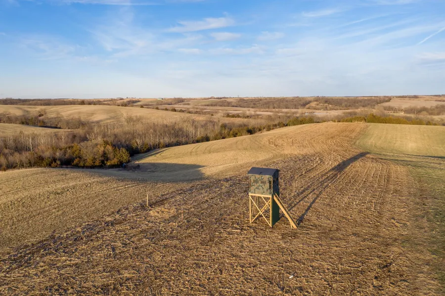 The farm currently offers 65 +/- acres of quality hay production that could be converted to tillable acres. Water sources are ample with two stocked ponds and a year-round creek running through the timber on the north end of the farm. Turkey hunting is sure to be great with quality alfalfa, rolling hills, and good nesting cover.