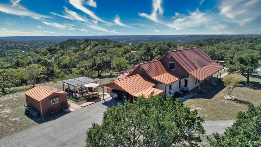 Discover authentic Hill Country Craftsmanship in this charming 3-bedroom, 2.5-bathroom home nestled on 10 acres. Revel in the sweeping southern vistas from the expansive back deck that has a miles long view to the hills on the south side of the Guadalupe valley. This well-appointed residence boasts a thoughtfully designed, contemporary kitchen, a striking floor-to-ceiling rock fireplace in the living room, and a spacious great room with a full-length bar. Additional highlights include a private office, generously sized master bedroom, and workshop. With paved private road access, fenced and cross-fenced areas, and a seasonal pond, this property offers a delightful blend of comfort and countryside allure.