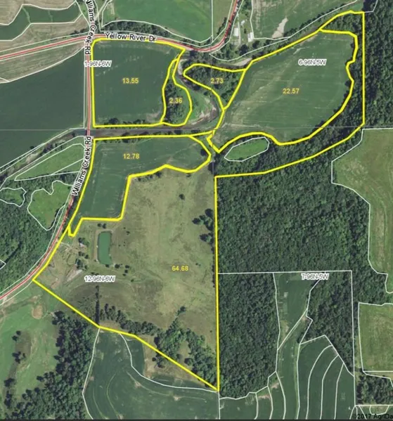 This is a well located recreational property on the Yellow River in scenic NE Iowa. Highway access with potential building site. Nice combination of recreation and income potential. Old machinery and trailer-house will be removed by Seller.