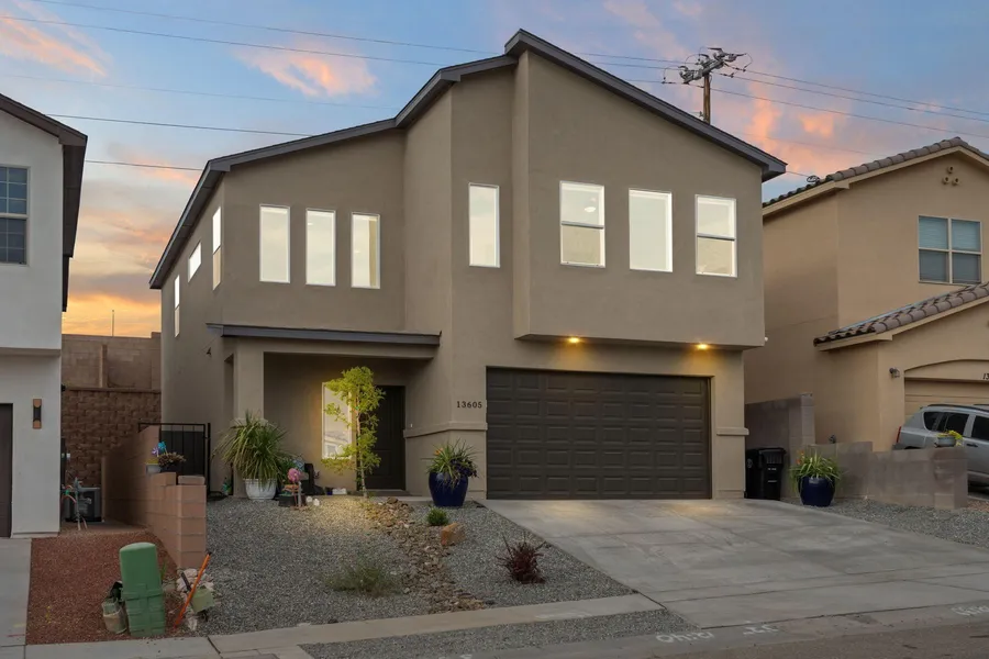 Experience modern elegance and quality craftsmanship in this stunning open-concept custom home featuring a soaring 20' entryway, quartz countertops, stainless appliances, raised panel doors, and an upstairs laundry for convenience. Energy efficiency shines with a tankless water heater, Carrier furnace, refrigerated air, and large low-E windows. Enjoy a fully landscaped front and back yard plus beautiful views. Conveniently located in North Four Hills, trails, Kirtland Airforce base, shopping, and dining at 10 minutes from uptown. With a 1/2/10 Builder's Warranty for lasting peace of mind.