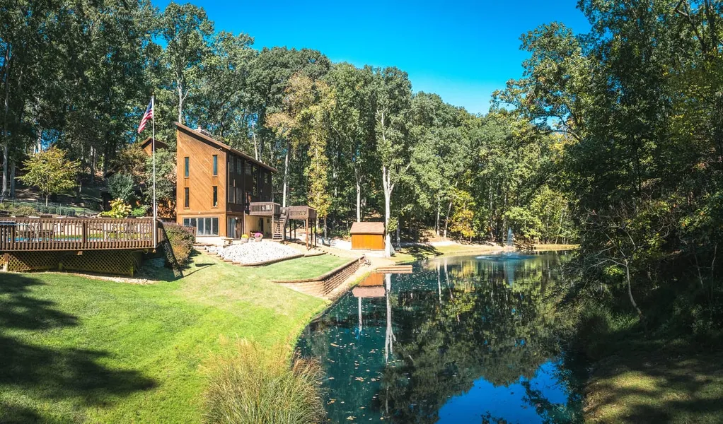 This stunning contemporary home, nestled on 9.57 picturesque acres, offers an exceptional waterfront view of a stocked lake, complete with a beautiful fountain. The lake is well-stocked with bass, bluegill, and catfish, perfect for fishing right at your doorstep. The main home boasts over 5,000 sqft of luxurious living space, designed to accommodate large families with ease. It features 4 spacious bedrooms, 4 baths, and breathtaking lake views from nearly every room. An entertainment room with a full bar offers the perfect setting for hosting guests. The outdoor space is equally impressive, with meticulous landscaping, retaining walls, and a serene park-like setting. There’s also a pool area, ideal for summer fun, and a detached 3-car garage with loft storage. Located within minutes of Fenton and St. Louis, this property offers the best of both worldspeaceful rural living with city conveniences close by