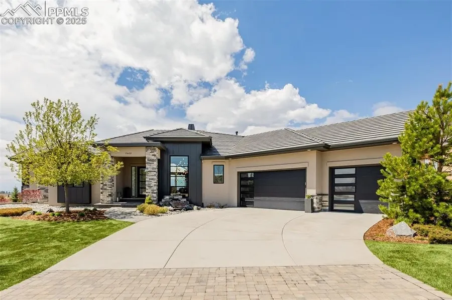 Tucked at the end of a tranquil cul-de-sac within the coveted gates of Calistoga at Flying Horse, this extraordinary residence is a modern study in elevated design, luxurious comfort, and architectural grace. Framed by unspoiled mountain vistas and sweeping views of the United States Air Force Academy campus, the home blends refined craftsmanship with contemporary sensibility across each light-filled level. An expansive open-concept living area sets a grand tone with soaring ceilings, a statement-making floor-to-ceiling stone fireplace, and a wall of glass that invite the outdoors in. The west-facing glass doors open onto a stylish balcony, where sunset views stretch across the horizon, perfectly extending the living space into the Colorado sky. Wide plank flooring and bespoke lighting fixtures lend warmth and sophistication throughout. The kitchen is a masterclass in modern elegance, with dark custom cabinetry, full-height angular backsplash, and abundant granite surfaces surrounding a generous center island. Double ovens, high-end appliances, and a striking hood fan create an environment as functional as it is beautiful. The dining room, equally luminous, captures mountain views in every season. A serene primary suite offers a private retreat, with a spa-like bath featuring a sculptural soaking tub, dual sinks, spa shower and perfectly considered details. A walk-in closet with custom built-ins enhances both form and function. Secondary bedrooms echo the home's elevated design language, while the finished walk-out basement is a destination of its own, complete with fireplace, wet bar with wine fridge, golf simulator, and seamless access to the artfully landscaped stone patio and hot tub. Discreetly set and framed by curated outdoor spaces, this is a residence that balances grandeur with intimacy and design with livability, all within one of the region's most prestigious communities.