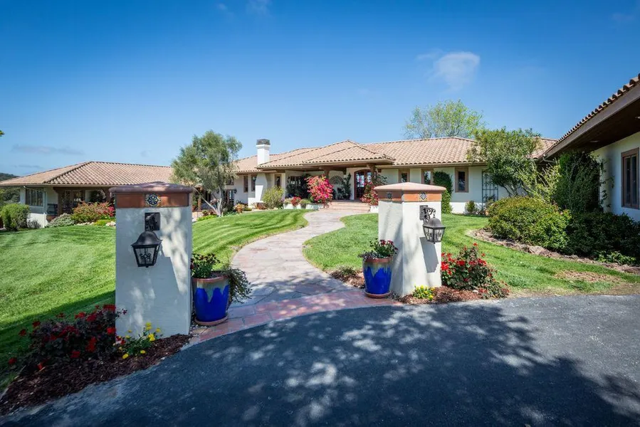 Lush grounds offer bright bougainvillea and roses, mature oaks, trickling fountains, garden, fruit and avocado trees, and an underground wine cellar. Enjoy hawks soaring through the canyon and abundant wildlife surrounding you from the many outdoor living spaces. Access to the home is an easy paved road. With the feeling of utmost privacy, this property is just 4 miles to the Village of Arroyo Grande, 7 miles to the regional airport, 8 miles to Pismo Beach and 10 miles to Downtown San Luis Obispo. Immerse yourself in this private hilltop wine country villa.