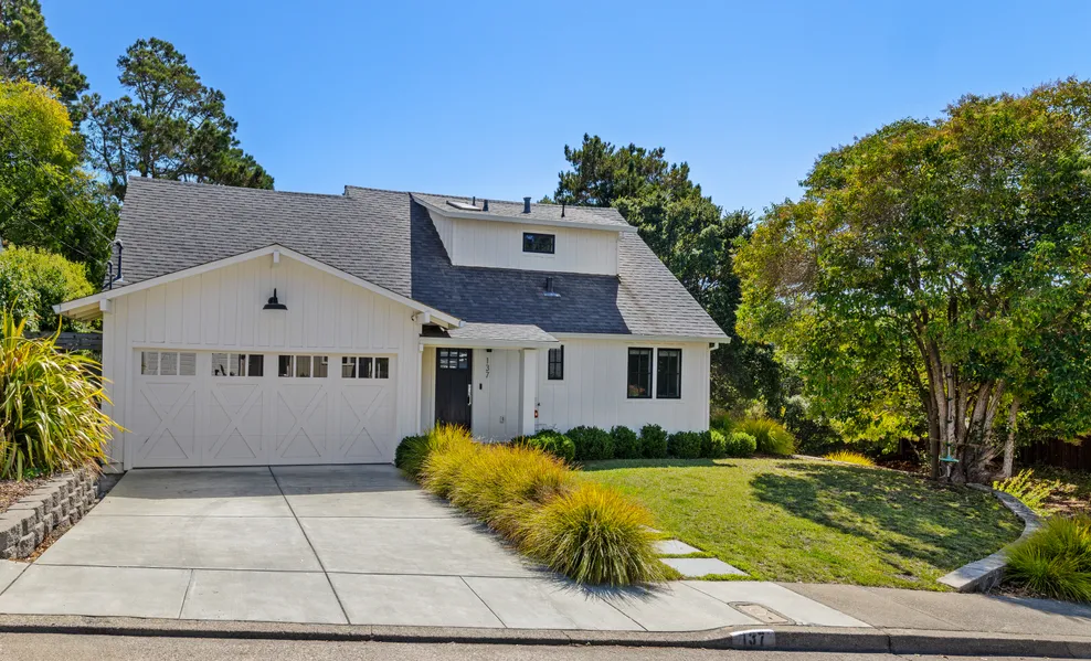Modern farmhouse style meets comfort and versatility with four bedrooms plus a separate ADU/guest house. The open great room features a fireplace framed by custom shelving and cabinets, a dining area with beautiful built in cabinetry, and effortless indoor-outdoor flow to the sunny deck and yard. The designer kitchen impresses with premium appliances including a Bertazzoni range, an island with seating, and a walk-in pantry. Hardwood floors and recessed lighting run throughout the home. The main level offers two bedrooms and a remodeled full bath, while upstairs, you’ll find the spacious primary suite with vaulted ceilings, walk-in closet, and a beautifully updated bath with dual sinks and large shower. An additional bedroom with walk-in closet and remodeled bath completes the upper level. The separate ADU is a true bonus with soaring ceilings, hardwood floors, kitchenette, a full 4th bath, and two storage lofts—perfect for guests, office, or rental. The fenced yard is designed for outdoor living & entertaining with a lawn, deck, dining area, outdoor fireplace, and water feature. Additional amenities include a two-car garage and Tesla Powerwall. Located in the sought-after Reed School District, with easy access to San Francisco, the Larkspur Ferry, shopping, dining, and trails.