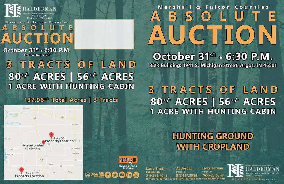 Legal Description 16 acres NE 1/4 SE1/4 and 1 acre Sec 6, Twp 32N, Range 3E; 40 acres NW1/4 SW1/4 Sec 5, Twp 32N, Range 3E, Walnut Twp, Marshall Cty: 80.54 acres E1/2 SW 1/4 Sec 9, Twp 31N, Range 3E, Richland Twp, Fulton Cty, Indiana