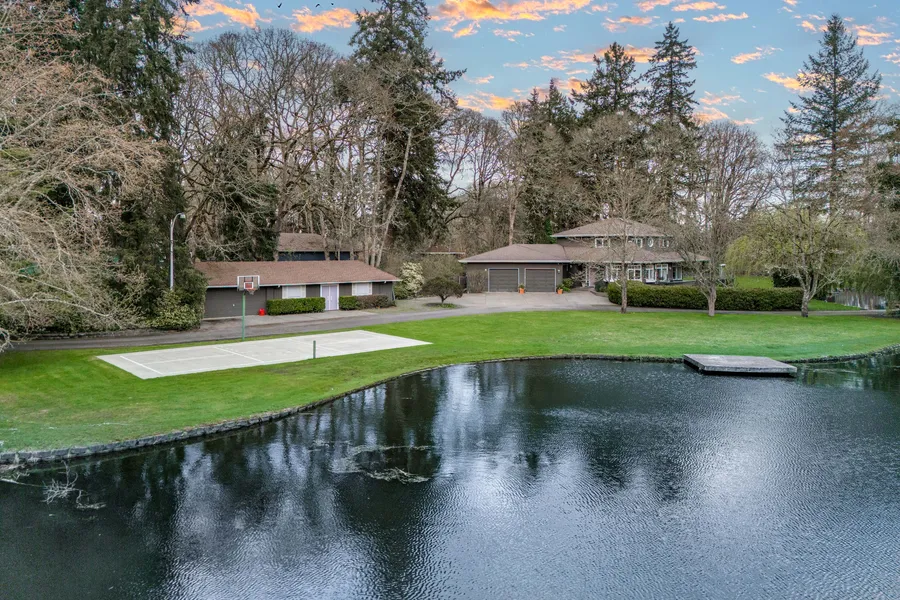 Price Improvement! On Purvis Pond you will find this GATED estate property with manicured grounds. Nearly 4 acres w/ a meandering creek that feeds out to Tule Lake. You can simply move into this home with updated & sun filled kitchen; gas cooking; stainless appliances and conversation sized island. All overlooking the POND and outdoor living areas. MAIN FLOOR primary suite w/ generous sized spa like bath w/ sauna-all overlooking your deck; grounds and the sounds of water. Upstairs--two more bedrooms; shared bath. 2ND DETACHED garage makes for perfect storage of all your toys, SPORTS COURT/PICKLE BALL court and even a quaint bridge to the acreage. OPEN SPACE designation allows for discounted taxes. Close to all services; minutes to I5 and JBLM. Unique.