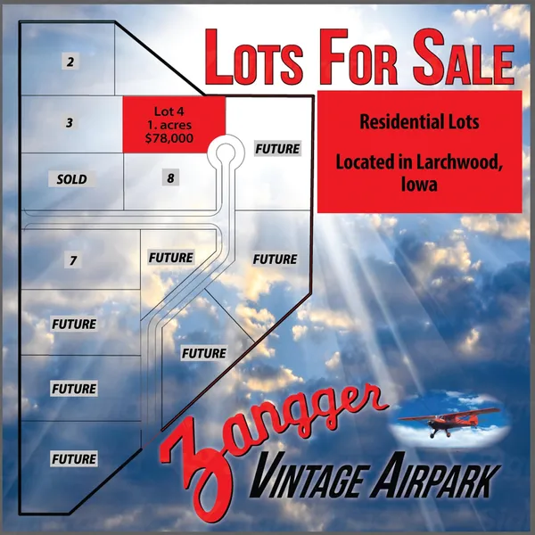 Residential lots just east of Larchwood, IA and situated on Zangger Vintage Airpark near the golf course. If you love all things aviation, this is for you!! If you desire beautiful scenery just outside of city limits in small town Iowa ~ all while being a short 15~minute drive to Sioux Falls, this is also for you!! The airport holds the distinction of being "vintage," not only for the fact of its age and historical importance to the Iowa aviation ecosystem, but also because "it's best suited for vintage, tailwheel aircraft," Jim said. Still, it has a runway suitable for anything up to a light twin and sees traffic from modern aircraft as well. (Quoted from a "Flying Magazine" article written May 2022). It is the oldest privately owned public use airport in Iowa and is the only one in the state with three runways. It is honored to be the first and, arguably, the only residential airpark in the state. The lots themselves offer beautiful Iowa scenery, generously sized and ready for your dream home. Covenants stipulate an accessory building, if built, be designed as a hangar to be built on the lot with a home. The home should be situated on the lot to accommodate this possibility. Reach out for more information ~ builder will need to work closely with the airpark to ensure all FAA airspace restrictions are met for the safety of the homeowner and the pilots who use the airpark. This is an absolutely beautiful place to build a home whether you appreciate aviation or not. Owner wants to welcome all but also desires to incentivize aircraft owners with a $5,000 discount!!!