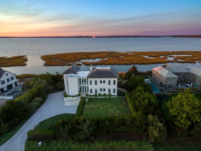 This stunning custom-designed home boasts approximately 140 feet of waterfront on Shinnecock Bay, complete with a private dock and breathtaking sunsets. Directly across the street, you have immediate access to ocean beaches via Road D. With a superior design that blends luxurious living with an indoor/outdoor flow over two levels, this residence offers water views from nearly every room. Enjoy the warmth of three gas fireplaces-one on the upper deck for al fresco dining, another in the elegant living room, and a third in the spacious primary suite. Featuring five bedrooms, five full baths, and two powder rooms, this impressive home spans over 5,100 square feet. This property is truly a show-stopper!