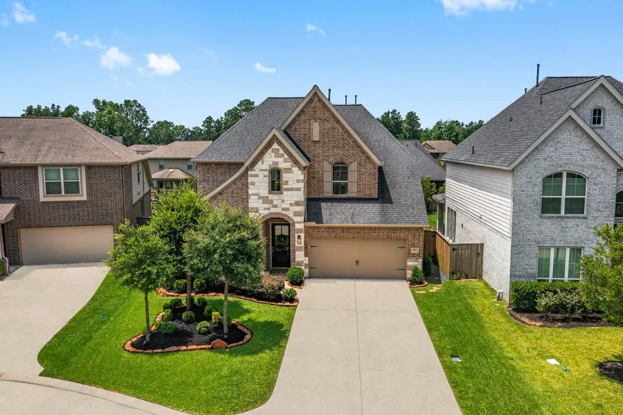 Welcome to this beautifully maintained home in the Deerborne Ridge section of master planned Woodforest! The brick and stone exterior, along with desirable landscaping, offers great curb appeal. Inside, a grand two-story foyer leads to a private home office. The open-concept kitchen features stainless steel appliances, modern finishes, and a breakfast bar. The spacious family room boasts soaring ceilings, a gas fireplace, and abundant natural light. The first floor also includes a guest bedroom with full bath, a mudroom off of the garage, and utility room. The primary suite offers an en-suite bath w/double sinks, walk-in shower, soaking tub and walk-in closet. Upstairs, enjoy a spacious game room, three additional secondary bedrooms, and two full baths. Outside, you'll find the covered patio—perfect for grilling, relaxing in the hot tub, or watching TV. A must-see!