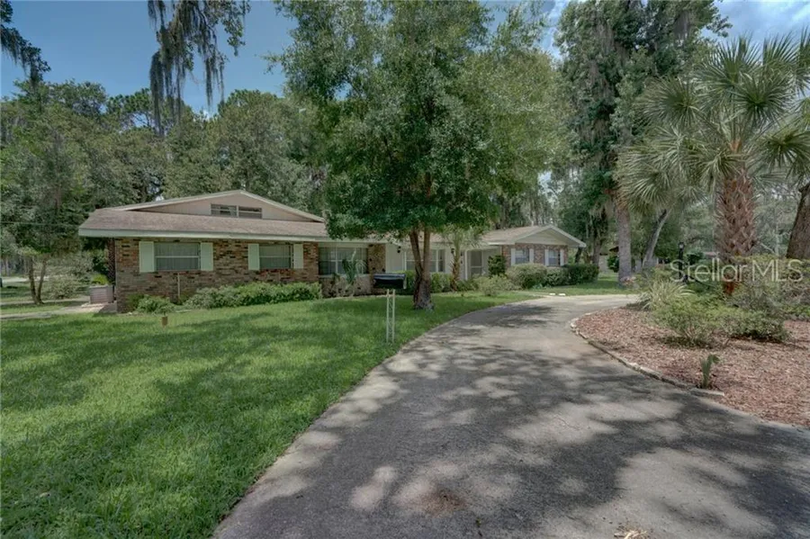 Garden View Estate. This sprawling 4 bedroom block home is close to the LAKE. The unique 2 story house has 2 master bedrooms downstairs, a loft area upstairs and 3 separate attached garages. Upstairs is a loft area, 2 bedrooms and extra storage space! Down stairs was designed for entertaining with the LARGE living room and family room. A formal dining room has nice big bay window, built in cabinetry and opens up to a spacious kitchen. Indoor laundry room has lots of storage space with built in shelves, cabinets and counter tops! The front of the home has a circle drive with tasteful landscaping. The back patio area has beautiful plants and flowers with a great water feature (new pump needed). Pleasantries surround you in the back yard with shade trees, fruit trees and so many nice plants. This LARGE home is one you can grow in. Plenty of space for all. Convenient to I-75 and Florida's Turnpike. Traveling is easy to Tampa, Orlando, and The Villages.