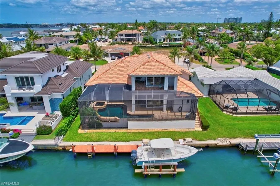 Situated on a quiet street in the heart of Royal Harbor, this premium waterfront residence offers over 4,100 square feet of thoughtfully designed living space and exceptional outdoor amenities. Enjoy southern rear exposure with tranquil canal views from the black-bottom infinity-edge pool, overlooking the private dock and deep-water canal. Designed for effortless indoor-outdoor living, the expansive screened lanai spans the length of the home and includes an outdoor kitchen-ideal for entertaining or relaxing dockside. The home features desirable first-floor living with the added flexibility of a spacious second level. The main level includes multiple generous living areas, a large primary suite, two additional ensuite bedrooms, a study, formal and informal dining areas, a well-appointed kitchen, powder room, and laundry. Upstairs, a versatile bonus level is perfectly suited as a private guest retreat, offering a large bedroom, full bath, oversized bonus room, and balcony with bay views. Boaters will appreciate the 13,000-lb boat lift and quick Gulf access via Gordon Pass in approximately 12 minutes. With a base floor elevation of 10 feet, the home has never experienced interior flood water. Royal Harbor's prime location places residents just minutes from downtown Naples, white-sand beaches, the Bay Shore Arts District, Baker Park, the Botanical Gardens, and everyday shopping and dining. Well maintained and priced to sell, this waterfront home is ready for a new owner to add personal touches and enjoy the best of the Naples boating lifestyle.