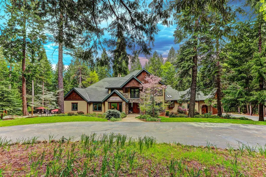 Elegance in the Mountains! Breathtaking, top quality home nestled on a gentle,private 4.3 acre parcel 4 miles to downtown Nevada City. Walk in the formal tiled entry and pause at the dramatic soaring 26' reclaimed wood beam ceilings and windows looking South, and feel like you are in a home in Tahoe! True gourmet kitchen with knotty alder cabinets, heated tiled floors and double oven & dishwashers and walk in Pantry. Great mud room off kitchen is also butlers pantry! Formal dining room, office and all bedrooms on main level (and handicapped friendly)with 10' ceilings; Theater room with all equipment and full bath, plus exterior access; huge loft for pool table, 4th ensuite bedroom and another office! PLUS, huge fenced swimming pool and waterfall, and solar panels for low PG&E! Enjoy the natural beauty of the gentle, cleared land and be at Scotts Flat Lake in 5 minutes! 3 car garage, circular driveway and gated entry. Extra 14X 28 garage, huge Ironwood deck and spa!