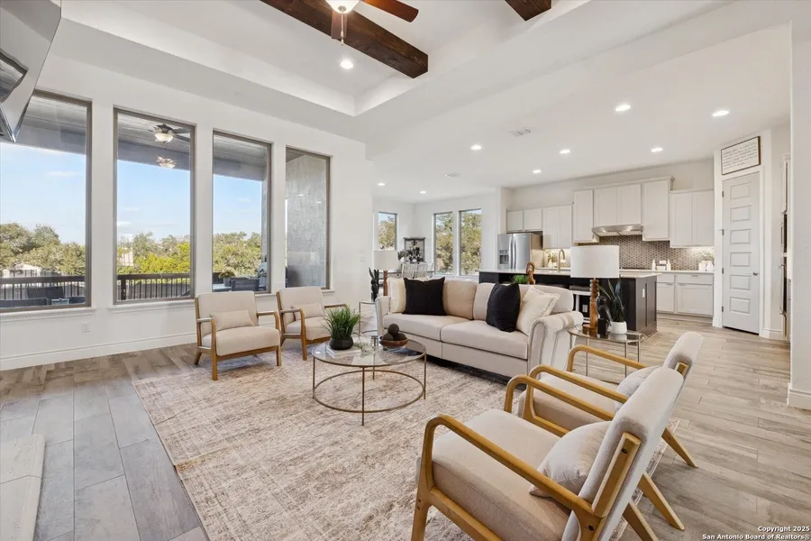 Welcome to the kind of home that just feels good from the moment you pull up. Sitting quietly at the end of a cul-de-sac on nearly a third of an acre, this single-story beauty offers over 3,300 square feet of space to spread out, unwind, and truly enjoy Hill Country living. Inside, you'll find tall ceilings, tinted windows, and a thoughtful open layout that fills the home with natural light. The kitchen was made for gathering - with an extended island, stainless appliances, and plenty of cabinet space for the family chef. The primary suite feels like its own little getaway, featuring a spa-inspired bath with a soaking tub, walk-in shower, and an oversized closet that could easily double as a dressing room. A private flex room with sliding barn doors makes the perfect home office, playroom, or media space depending on your needs. Step outside to a covered patio made for quiet mornings or backyard get-togethers. The wrought iron fence opens to a peaceful greenbelt backdrop, and there's plenty of room for a pool, garden, or outdoor kitchen. All tucked inside a quiet, well-kept neighborhood within Comal ISD, just minutes from H-E-B Plus, Hwy 281, and all the shopping and dining along Hwy 46. If you've been searching for space, peace, and a home that feels like it was made for both relaxing and entertaining - this is the one.